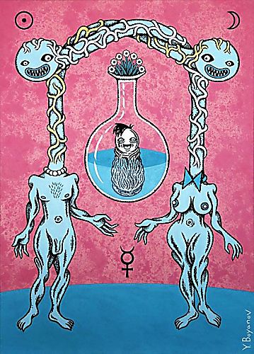 Воден от вярата си в духовната сила на изкуството и вдъхновен от различни езотерични направления, в изложбата “Еонът на Постартиста” развивам идеята за месианската фигура на артиста на Новата Епоха. Създавам образа на Свещеното постартистично дете и адаптирам към изгражданата от мен митология понятия и постулати от алхимията, магията, Розенкройцерството и Телема. Развитието на моя герой онагледявам, поставяйки го в сюжети от големите аркани на картите Таро. Превръщам го в своеобразен символ на Новата Епоха, характеризираща се с откриването на Истинската Воля на индивида и нейното реализиране, приемането на живота и смъртта като две отделни фази на съществуването, примиряването на противоположностите, разбирането, че любовта е движещата сила във Вселената и осъзнаването, че Бог не е външен фактор, а е във всеки един от нас.