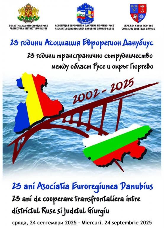 Асоциация „Еврорегион Данубиус“, една от водещите организации в сферата на трансграничното сътрудничество между България и Румъния, ще отбележи своята 23-та годишнина. Събитието ще се състои на 24 септември (сряда) от 11:00 часа в заседателната зала на Окръжния съвет в Гюргево.