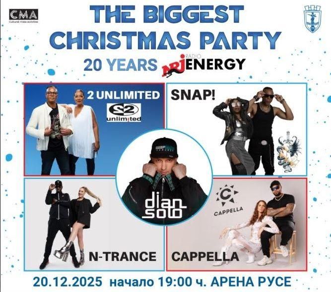 На 20 декември 2025 Русе ще се превърне в център на най-голямото коледно събитие в България – THE BIGGEST CHRISTMAS PARTY, организирано по повод 20-ата годишнина на най-любимото радио на България – Радио ENERGY. На една сцена за първи път в Русе ще се съберат някои от най-емблематичните имена в историята на европейската денс музика. 2 Unlimited – дуетът, който завладя световните класации с енергични хитове като No Limit и Get Ready for This, ще завладее феновете на златната ера на 90-те с експлозия от ритъм и настроение.