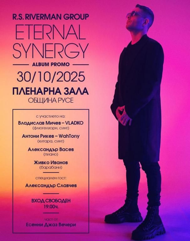 R.S. Riverman идва в Русе, в рамките на ЕСЕННИ ДЖАЗ ВЕЧЕРИ за да представи “Eternal Synergy” - вторият авторски албум, обединяващ част от най-изявените музиканти на съвременната българска сцена. Концертът е на 30 октомври, от 19:00ч., в Пленарна зала.