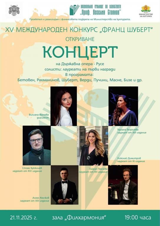 За поредна година от 21 -ви до 25 -ти ноември в Русе ще се проведе престижния Международен конкурс “ФРАНЦ ШУБЕРТ”. На 21 ноември, петък, от 19 часа в зала "Филхармония", Държавна опера - Русе, съвместно с НУИ "Проф. Веселин Стоянов" – Русе, ще сложат началото на петнадесетото издание на конкурса с Концерт - откриване под диригентската палка на маестра Вилиана Вълчева.