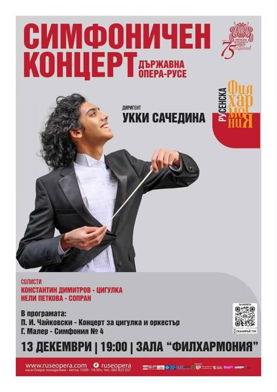 На 13 декември от 19 часа в зала "Филхармония" Русенска филхармония ще представи със Симфоничен концерт с диригент Укки Сачедина и солисти Константин Димитров - цигулка и Нели Петкова - сопран. Концертмайстор на оркестъра на Русенска опера е Тамара Лазарова.