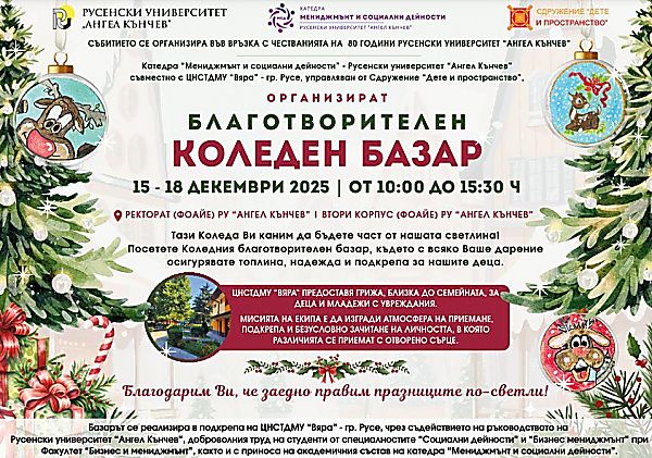 Благотворителен коледен базар в подкрепа на децата и младежите с увреждания от Центъра за настаняване от семеен тип "Вяра" ще се състои в Русенския университет "Ангел Кънчев" от днес до 18 декември (четвъртък).