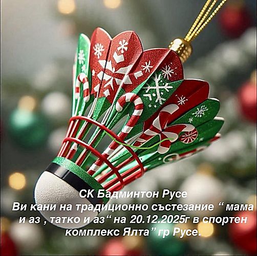 СК "Бадминтон" Русе кани на специално Коледно състезание по бадминтон "Мама и аз, татко и аз", което ще се проведе на 20 декември в спортен комплекс "Ялта". Това събитие е чудесна възможност за семействата да прекарат време заедно, да се забавляват и да се насладят на духа на празниците чрез спорта.