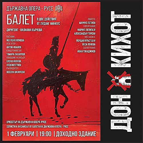 На 1 февруари, неделя, от 19:00 ч. в Голямата зала на Доходно здание Държавна опера – Русе ще бъде представен класическия балет „Дон Кихот“ от Лудвиг Минкус. Спектакълът в две действия е по либрето на Мариус Петипа, с хореография на Петипа и Александър Горски и постановка на Йордан Кръстев и Веса Тонова.