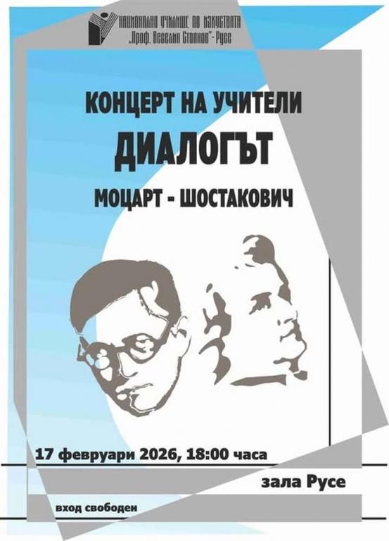 20 преподаватели от Националното училище по изкуствата „Проф. Веселин Стоянов“ в Русе ще изнесат концерт под надслов „Диалогът Моцарт–Шостакович“ на 17 февруари, от 18:00ч., в зала „Русе“. Това съобщи директорът на учебното заведение Здравко Саралиев.