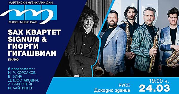 На 24 март публиката ще има възможност да се наслади на концерта на немския саксофонен квартет „SIGNUM“, известен със своя новаторски стил и впечатляваща сценична енергия. Музикантите ще представят разнообразна програма с произведения от Едвард Григ, Антонин Дворжак, Джордж Гершуин и Ленард Бърнстейн, показвайки богатите възможности на саксофона в класическата и модерната музика.