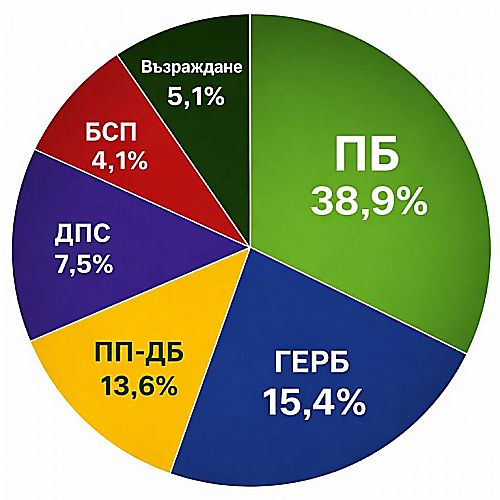 На второ място се нарежда ГЕРБ-СДС с 15,4%, следвани от ПП-ДБ с 13,6%. ДПС събира 7,5%, а „Възраждане“ – 5,1%.