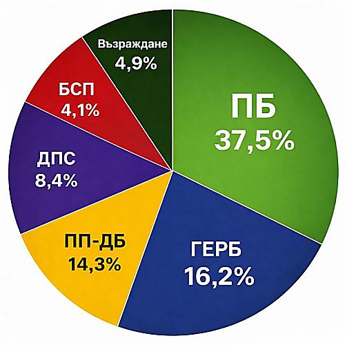 Първите прогнозни резултати от парламентарния вот очертават убедителна преднина за формацията на президента Румен Радев. Според екзитпола на „Алфа Рисърч“ към 19:00 часа „Прогресивна България“ събира 37,5% от гласовете.