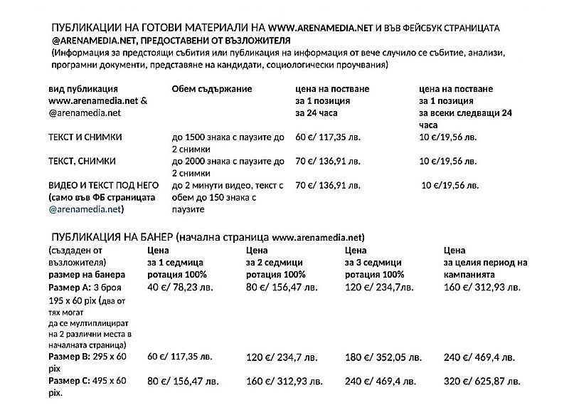 ТАРИФА ЗА ПЛАТЕНИ ПУБЛИКАЦИИ И УСЛУГИ Арена Медиа е частна медиа, базирана в Русе. Екип професионалисти развива независима журналистика в полето на всекидневната информация повече от 20 години. Защитаваме правата на местните общности да участват в процесите на вземане на информирани решения. Лицата на Арена Медиа са наследници на първата частна радиостанция в Русе „Темпо“, създадена през 1992 г. Независимият информационен портал Арена Медиа е регистриран през 2007 г. и се развива стабилно в полето на дигиталните медии чрез каналите: Сайт www.arenamedia.net , Фейсбук профил @arenamedia.net , YouTube канал Arena Media. Аудитории: Среднодневната аудитория на сайта ни е 1000 души, средномесечната: 30 000. Потенциалната аудитория при обвързано публикуване достига 76 500 потребители месечно. Спазваме Етичния кодекс на българските медии от приемането му през 2004 г. Носители сме на различни журналистически и медийни награди. Арена Медиа е лидер в отразяването на социални, политически и културни теми в Русе, според резултатите от проучване на медийната среда, извършено от Русенски университет „Ангел Кънчев“ по поръчка на Областна управа Русе през октомври 2020 г. Арена Медиа е предпочитан източник за информация на аудитория на възраст между 14 и 65 години. Преобладават представителите на женския пол (52.3%), с предимно висше образование, които обикновено имат интереси към социални, политически и културни теми. Като продуцентска компания Арена Медиа предлага цялостна система на аудиовизуални дигитални услуги. 4. СЪЗДАВАНЕ НА ВИДЕОПРОДУКТИ: Арена медиа има 20 годишен опит в продуцирането на различни видеоформи (видеоклипове, видео информационнни материали, репортажи, тийзъри, документални филми.) Разполага с напълно затворен производствен цикъл ( препродукция, продукция, постпродукция). Цената за създаване на даден видеопродукт се определя в зависимост от спецификата му – снимачен период, необходима техника, продължителност на продукта, графични решения, мултиплициране – напр. Общ графичен дизайн с различни участници и послания) ВСИЧКИ ЦЕНИ СА С ВКЛЮЧЕН ДДС!