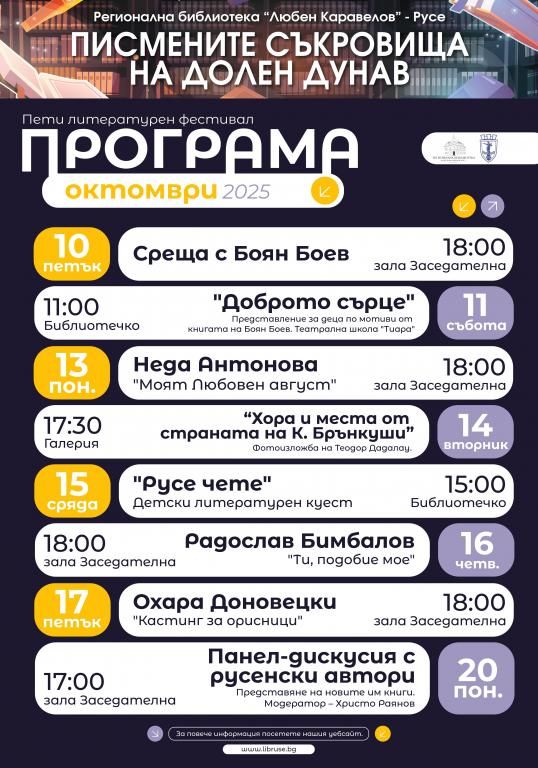Регионална библиотека "Любен Каравелов" ще проведе петото издание на фестивала "Писмените съкровища на Долен Дунав". Започнал през 2021 г. , този форум има за цел да представи добре познати и непознати за русенската публика автори, идеи, процеси в областта на литературата и хуманитарното познание. Събитията в рамките на фестивала са насочени към деца и възрастни.
