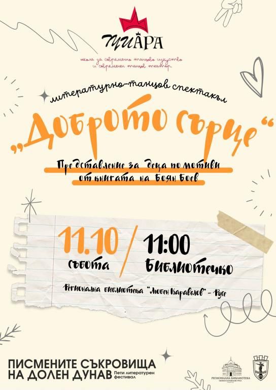 На 11 октомври (събота), в 11:00 ч., в Библиотечко, в рамките на V литературен фестивал „Писмените съкровища на Долен Дунав“, малките русенски читатели ще видят „ДОБРОТО СЪРЦЕ“ - литературно-танцов спектакъл, създаден с много любов и доза вълшебство от хореографа Златина Колева и танцова школа „Тиара“ по приказките от едноименната книга на писателя Боян Боев.
