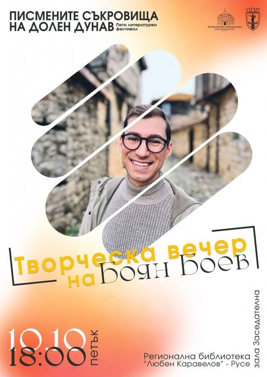 Началото е на 10 октомври (петък), в 18:00 ч., когато в зала Заседателна ще се проведе творческата вечер на писателя Боян Боев. Той е роден в град Ямбол. Още от детските си години има интерес към литературата и фолклора. Има икономическо образование, но предпочита да прекарва времето си сред книгите. Ще бъдат представени книгите "Сайбиевата невеста", "Последна молитва", "Двайсет гроша" и "Доброто сърце".