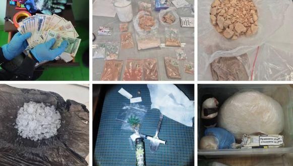 Били са претърсени няколко адреса в двата града. Иззети са значителни над 380 грама фентанил, над 400 грама метамфетамин, марихуана, прахообразни и кристалообразни вещества и таблетки с неустановен състав. Иззети са и над 15 000 лева, електронни везни, спринцовки с прозрачна течност и мобилни телефони, използвани за престъпната дейност.