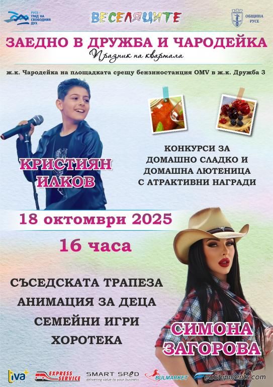 На 18 октомври 2025 г. (събота), от 16:00 часа, жителите на кварталите „Дружба“ и „Чародейка“ ще се съберат заедно, за да отпразнуват своя Празник на квартала под мотото „Заедно в Дружба и Чародейка“. Инициативата се организира за шеста поредна година от Общинска фондация „Русе – град на свободния дух“ с подкрепата на „Тива Плюс“ ЕООД, „Смарт Спед“ ЕООД, „Експрес Сервиз“ ЕООД, „Булмаркет Си Ен Джи“ ЕООД.