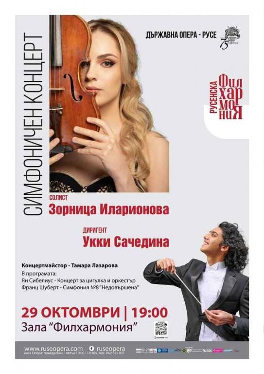 Оркестърът на Русенската опера ще изнесе симфоничен концерт на 29 октомври (сряда) в зала Филхармония в крайдунавския град. Диригент ще бъде Укки Сачедина, а солист - цигуларката Зорница Иларионова.