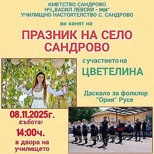Традиционният празник на село Сандрово ще се състои на 8 ноември (събота), като организатори на събитието са Кметство Сандрово, местното читалище „Васил Левски-1928 г.“ и Училищното настоятелство.