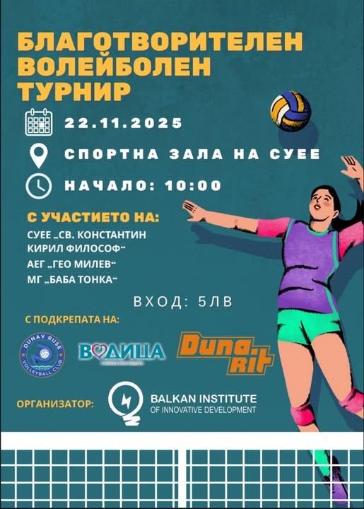 На 22 ноември, събота, от 10:00 часа, в спортната зала на Средно училище за европейски езици (СУЕЕ) в Русе ще се проведе благотворителен волейболен турнир. Инициативата е насочена към събиране на средства за дом за деца в неравностойно положение и лишени от родителска грижа.