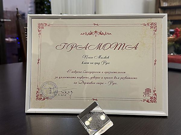 В края на срещата оперният директор връчи на кмета почетен кристален знак и грамота с благодарност и признателност за цялостна подкрепа, доверие и принос към развитието на Държавна опера – Русе.