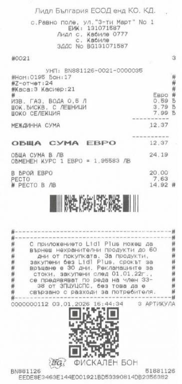 Касовата бележка задължително ще показва единичните цени в евро на всеки артикул, а общата сума за плащане ще бъде изписана в евро, заедно с нейната равностойност в левове. За допълнително удобство на клиентите, Lidl ще посочва в касовите си бележки и размера на рестото в левове.