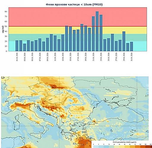 Превишенията са наполовина по-малко в сравнение със същия период на миналата година, когато са били 12, а средномесечната концентрация е била 35,4 микрограма на кубичен метър. Периодите с високо атмосферно налягане, ниски скорости на вятъра, по-ниски температури и битово отопление са сред факторите, допринесли за замърсяването. Някои дни са отчетени и с трансграничен пренос на пустинен прах.