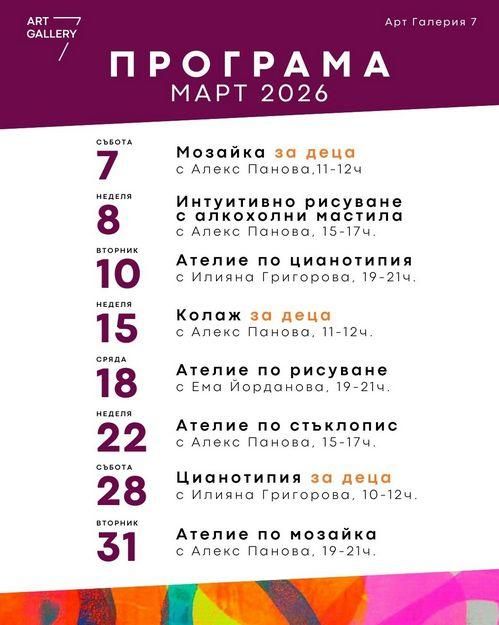 С настъпването на пролетта АРТ ГАЛЕРИЯ 7 отваря вратите си за месец, изпълнен с цветове, експерименти и вдъхновение. Март е идеалното време да развиете въображението си, независимо дали сте дете или възрастен.