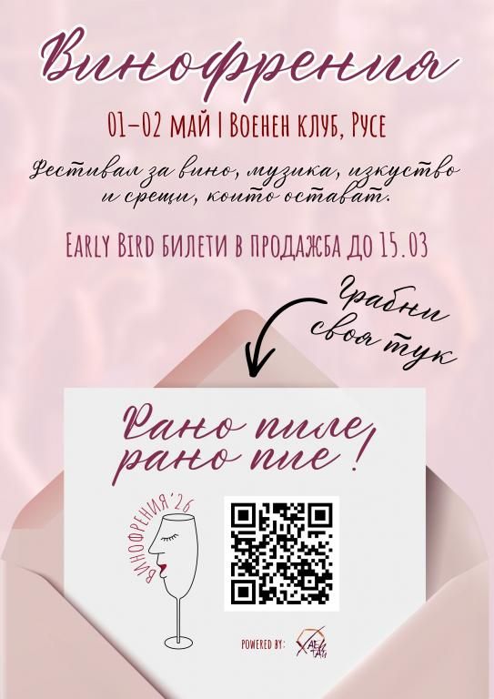 На 1 и 2 май в двора на Военния клуб и в Летен театър – Русе ще се проведе второто издание на фестивала „Винофрения“ – градски фестивал за ценителите на българското вино, фермерските продукти и добрата музика. Организатори на събитието са Ани и Деян Герасимови от Фондация „Хабитати“, които надграждат успешния старт от миналата година.