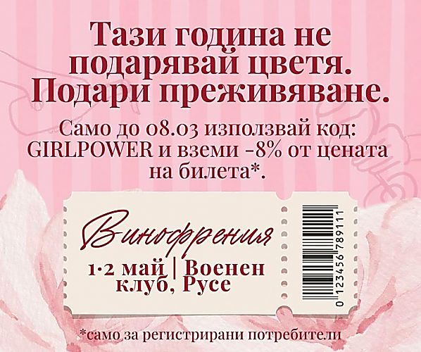 Първите билети за фестивала вече са в продажба, а с приближаване на събитието цената им ще се увеличава. По случай 8 март организаторите обявиха специален код GIRLPOWER за още по-голяма отстъпка за билети – жест към дамите и всички почитатели на виното, които искат да планират участието си предварително.