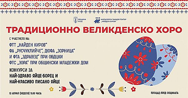 Традиционното великденско хоро отново ще събере русенци и гости на града в сърцето на Русе, носейки празнично настроение, музика и фолклорни ритми. За 35-и пореден път Община Русе и Фолклорен танцов театър „Найден Киров“ канят жителите и посетителите да споделят заедно радостта от най-светлия християнски празник.