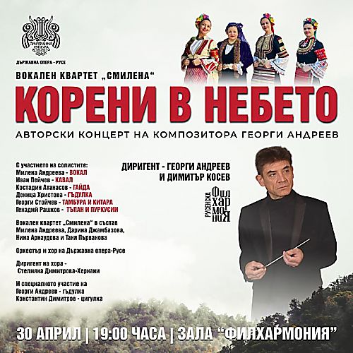 Русенската опера ще представи авторския концерт на композитора Георги Андреев "Корени в небето" на 30 април в зала "Филхармония" в крайдунавския град. Събитието е посветено на 150 години от избухването на Априлското въстание, съобщи Лилия Морале от културната институция в Русе.